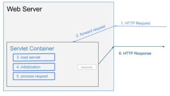 5. 컨테이너가 서블릿의 service() 메소드를 호출하여 HTTP 요청을 처리합니다.