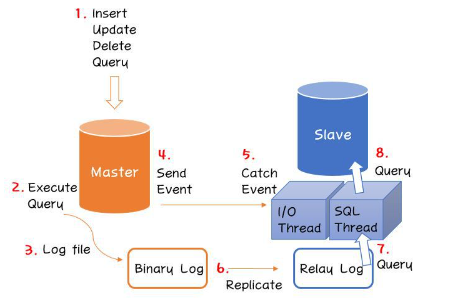 - Slave SQL Thread에서 Relay Log를 읽어(7) Slave DB를 업데이트합니다(8).