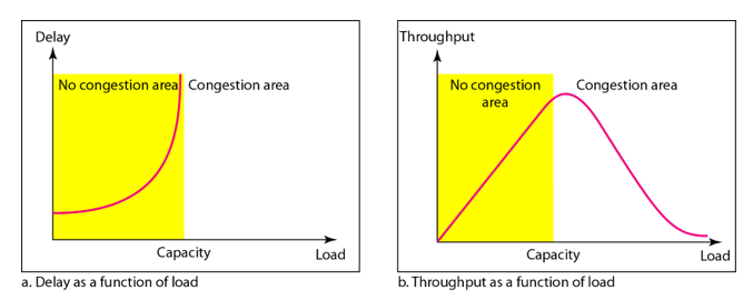 다음 그림은 단위 시간 당 입력되는 패킷의 수(input load)와 단위 시간당 처리되는 패킷의 수(throughput), 그리고 패킷이 처리될 때 까지의 지연 시간(delay) 관계를 보여 주고있습니다.