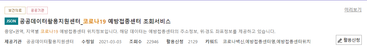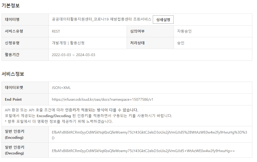 활용신청이 완료되면 아래와 같이 나오는 모습을 확인할 수 있습니다.