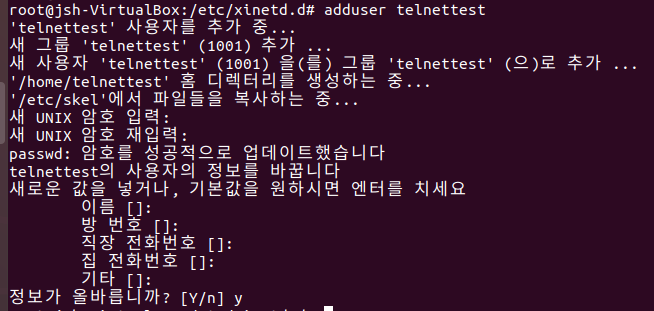 3. adduser 생성 (텔넷 전용 사용자 생성)