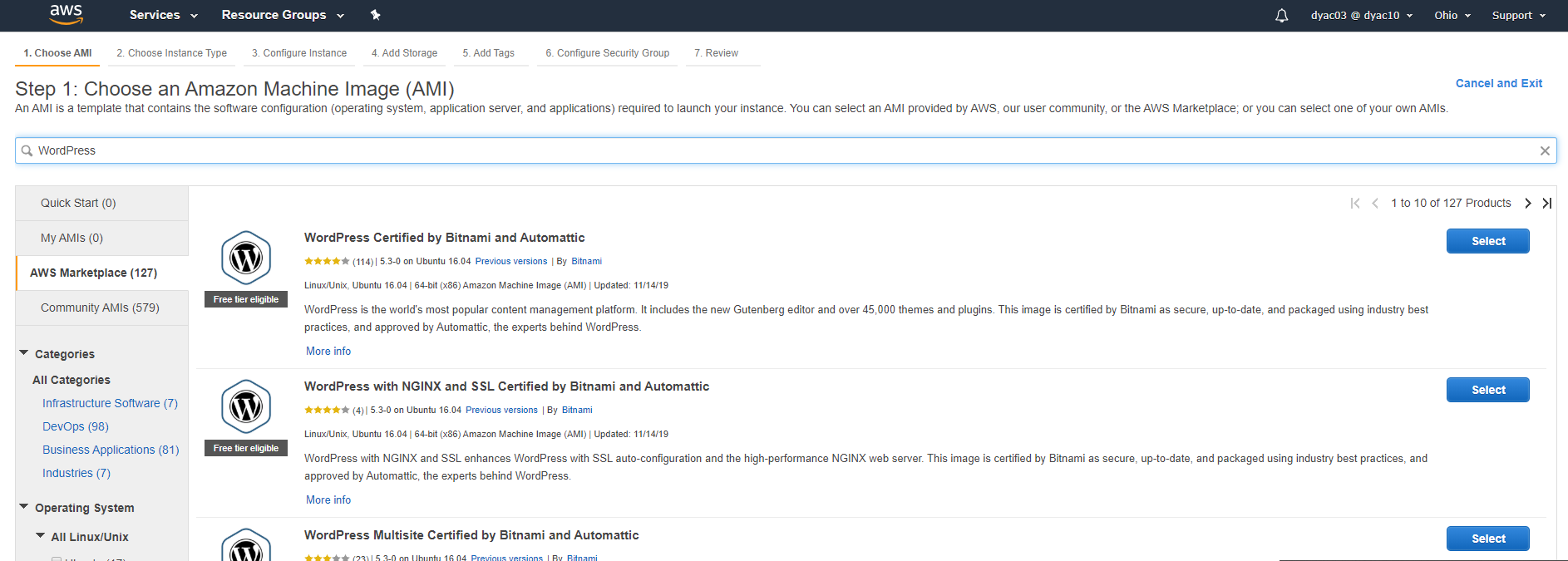 Instance 클릭 화면 여기서 검색에 WordPress 를 검색하시면 됩니다.