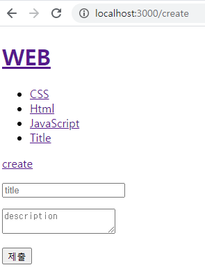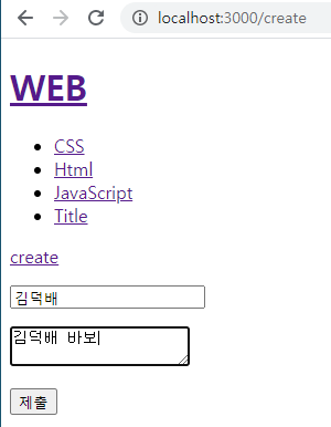 templateHTML()의 함수의 3번째 인자로 ${body} 부분이기에 그 부분에 사용자 입력 form을 만들었습니다.